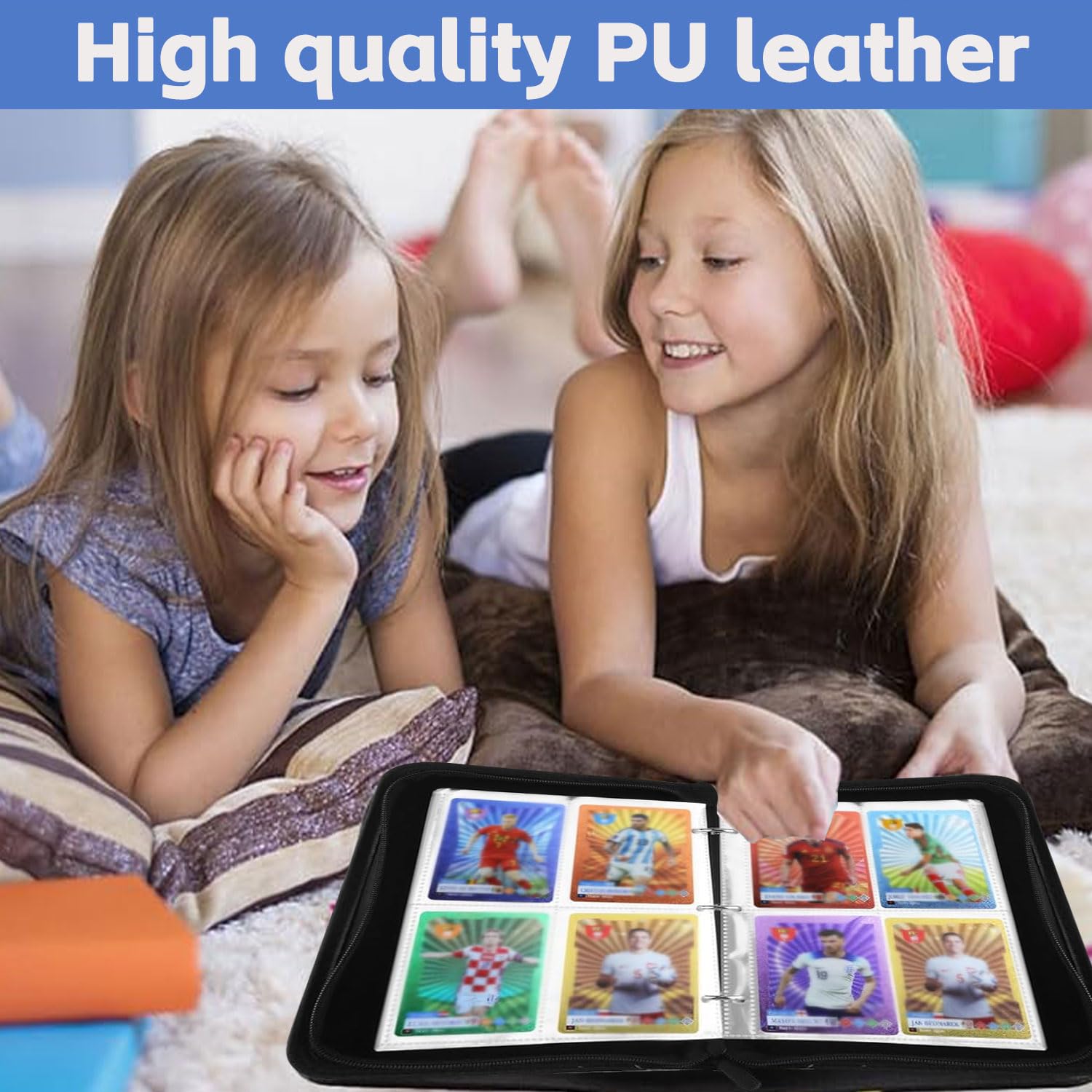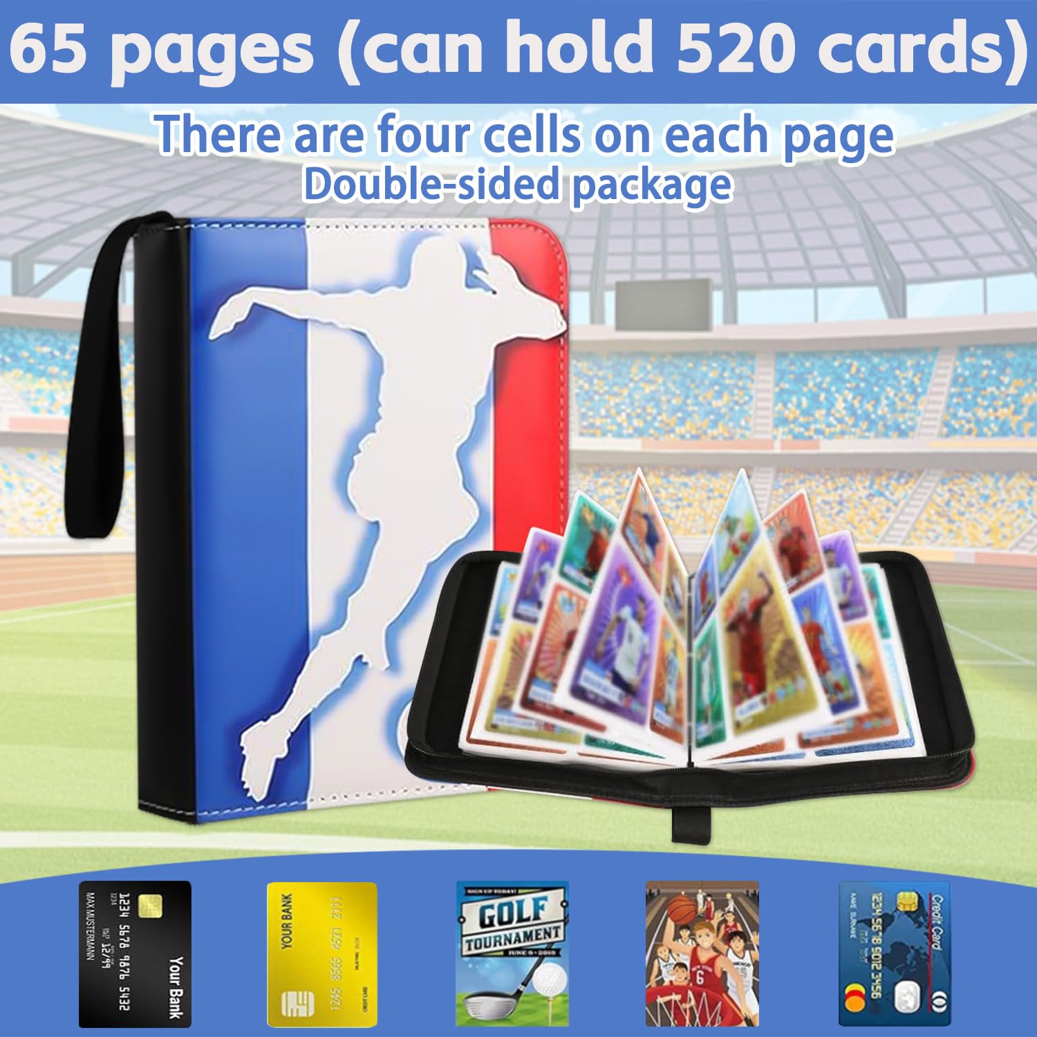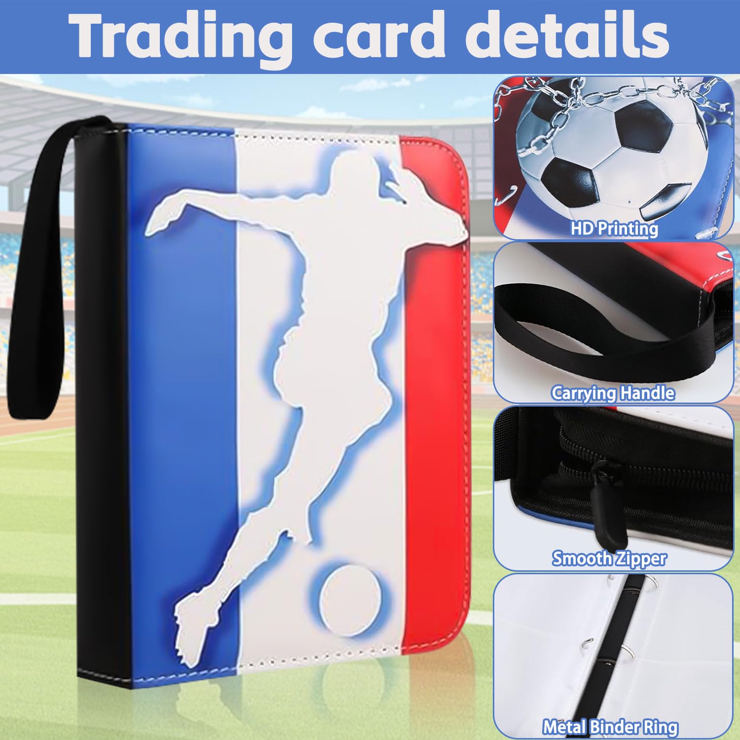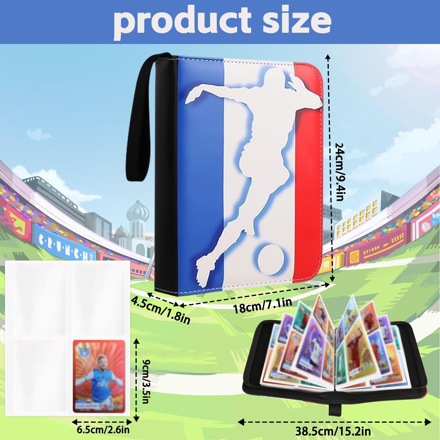 Cet album de collection est parfait pour ranger vos cartes de football ! Avec 65 pages (soit 520 emplacements), il protège précieusement votre collection. Couverture en cuir PU imperméable avec designs de joueurs stars. Fermeture éclair pour une sécurité optimale + dragonne de transport. Poches transparentes pour voir vos cartes facilement. Dimensions adaptées aux cartes standard. Un cadeau idéal pour les fans de foot de 7 à 77 ans ! Qualité premium à prix malin.