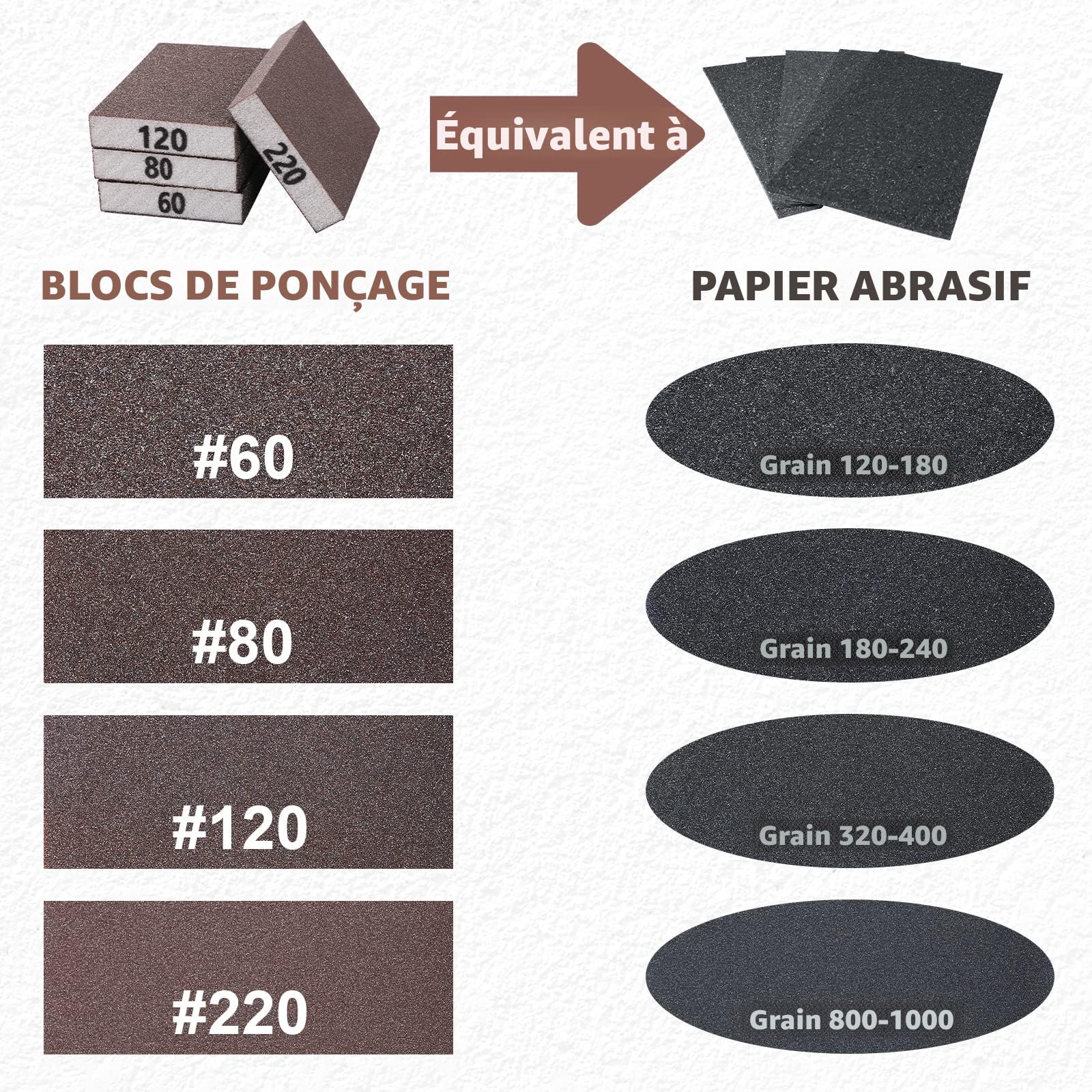 Ce lot de 8 éponges de ponçage est le compagnon idéal pour tous vos projets ! Avec 2 éponges de chaque grain (120, 220, 320, 400), vous passez du dégrossissage à la finition en un clin d'œil. Design 4 côtés abrasifs pour plus de longévité. Éponge haute densité qui ne se déchire pas et épouse parfaitement les surfaces courbes. Utilisation à sec ou à l'eau pour réduire la poussière. Lavable et réutilisable - plus économique que le papier de verre ! Parfait pour le bois, la peinture, le métal, le plastique et les plaques de plâtre. Léger et ergonomique pour un travail de précision. L'outil indispensable des bricoleurs et professionnels !